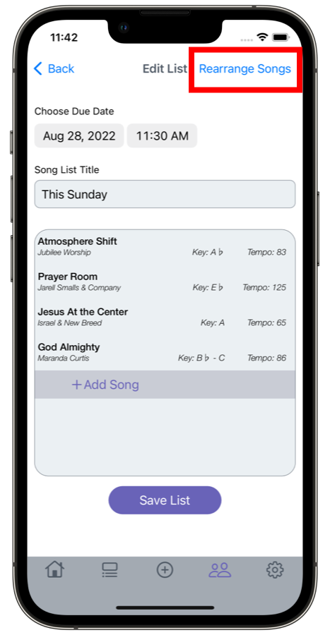 To change the order of the songs, tap on “Rearrange Songs” located in the top right of the screen, then drag each song to the order that you would like, then tap done. When finished tap “Save List” to save your song list You can edit a song list by tapping on the list.