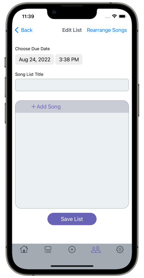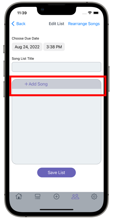 Create a song list by tapping on the ‘plus’ gyph. Choose a due date and time for the song list. This would be the date and time that you will be using this song list to perform. Creating a name for the song list is optional.
