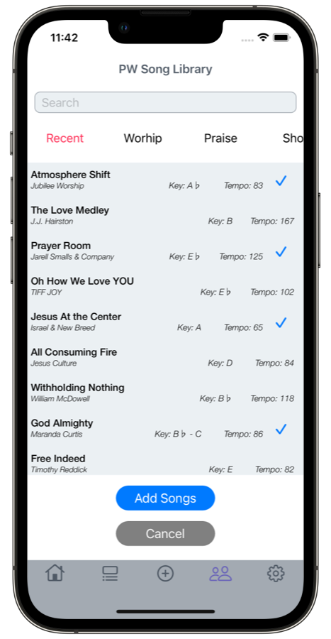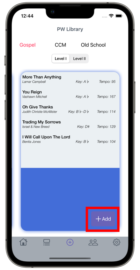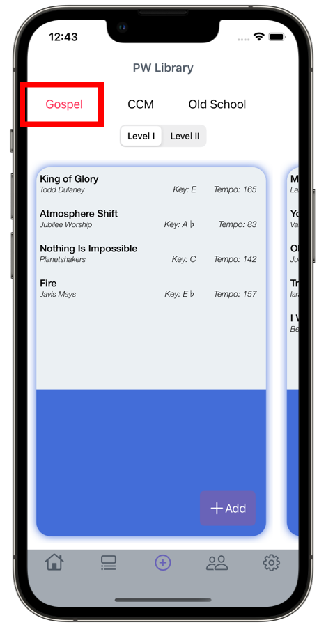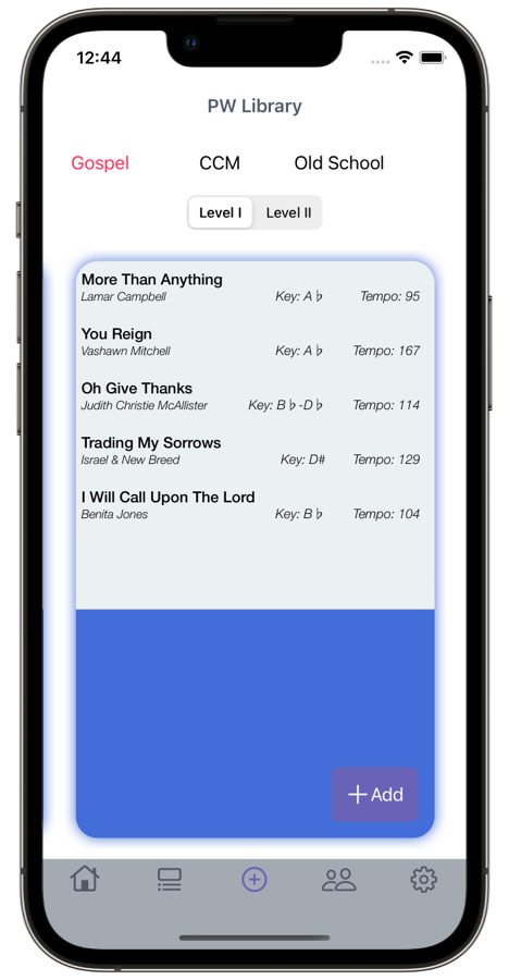 Pre-made song lists are the list of songs assembled by us for you to quickly add and use for your next church service. Since there are different types of churches with different tastes of praise and worship songs, we have song list categories for Gospel (which also have mixes of CCM), CCM, and Old School. Gospel having two sub categories: "Level I" and "Level II". You can also use These pre-made song lists as a template, by adding a pre-made song list, add/remove songs, and/or change the order.