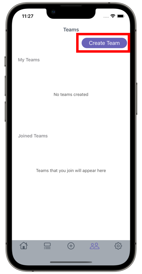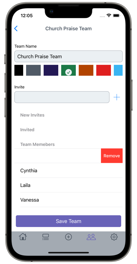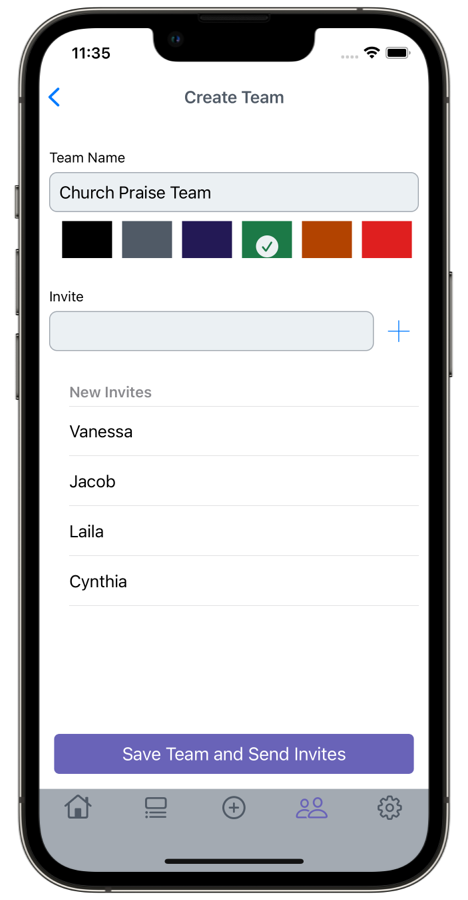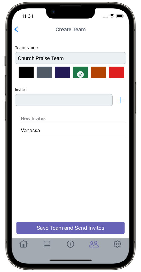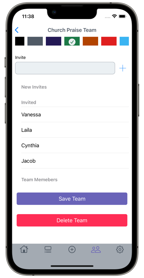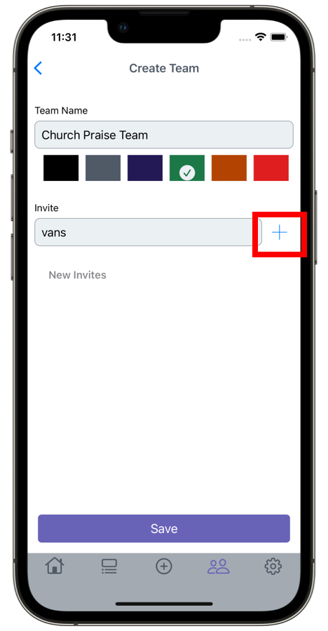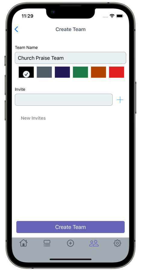 To create a team, navigate to the teams tab, tap on “Create Team”. Create a name for the team, choose a color and `invite` the members that you want on your team.